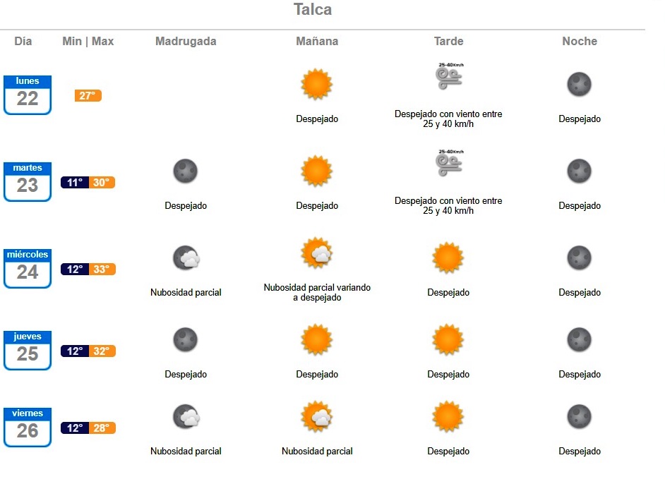 Esta situación en la región del Maule ocurrirá el miércoles 24 de febrero. En Talca, Curicó, Linares y Cauquenes ese día se pronostican 33°C. Mientras que para el fin de semana en las ciudades del valle los termómetros llegarían a los 32°C.